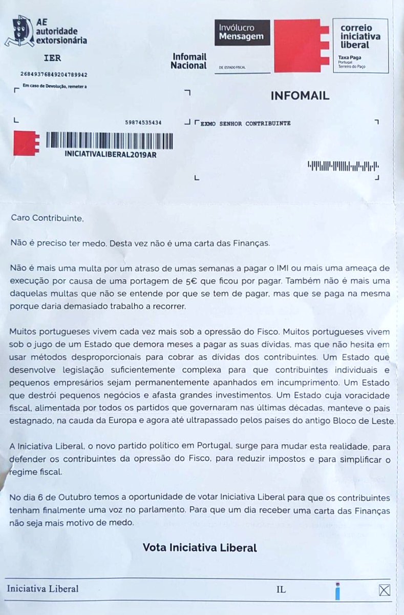 Iniciativa Liberal envia ‘carta’ aos contribuintes. “Não é preciso ter medo. Desta vez não é das Finanças”http://expresso.pt/legislativas-2019/2019-10-02-Iniciativa-Liberal-envia-carta-aos-contribuintes.-Nao-e-preciso-ter-medo.-Desta-vez-nao-e-das-Financas …