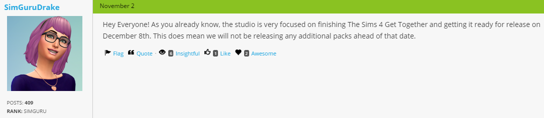 SimsVIP @SimsVIP#TheSims4: No New Game/Stuff Packs prior to Get Together http://simsvip.com/2015/11/03/the-sims-4-no-new-packs-prior-to-get-together/ … pic.twitter.com/78GmJWdl8o11 retweets 74 likes -