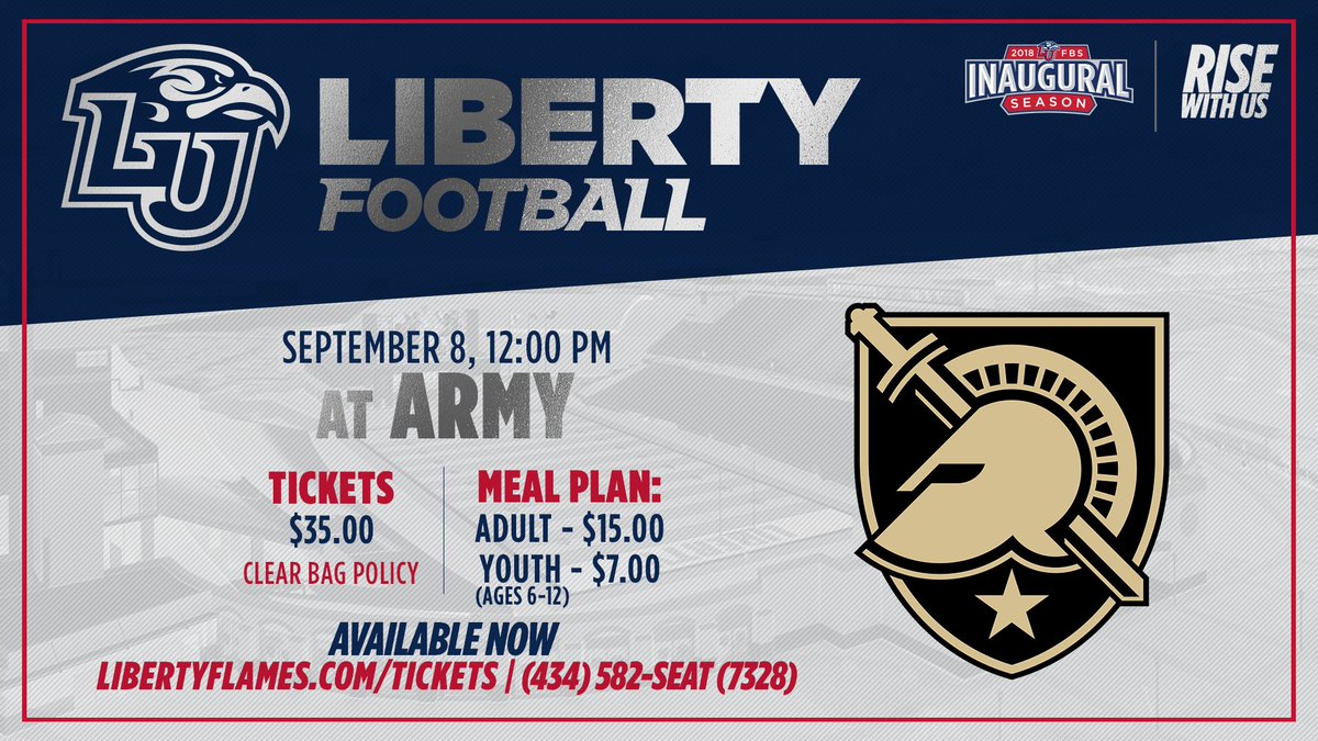 @LibertyFootball vs Army tickets that have just been put back on sale! Grab your tickets now before they are gone! Call 434-582-7328 or go to http://www.libertyflames.com/tickets . Tickets will go off sale at 10 am Friday, September 7!#RiseWithUs#BeatArmypic.twitter.com/HV1I93cNLv