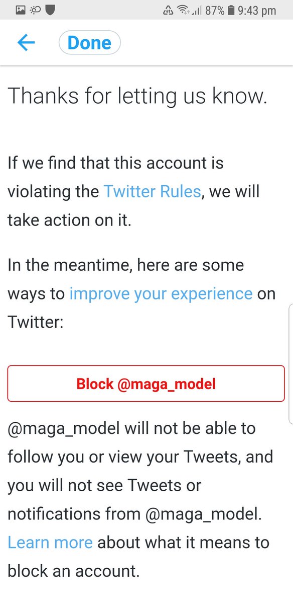 #Resisters. Go to#Trumps's Twitter account and look at his list of followers. Pick one with a random name, no avatar, no followers, no tweets etc. Report it as suspicious & fake account. I've knocked off 12 in 5 minutes. -