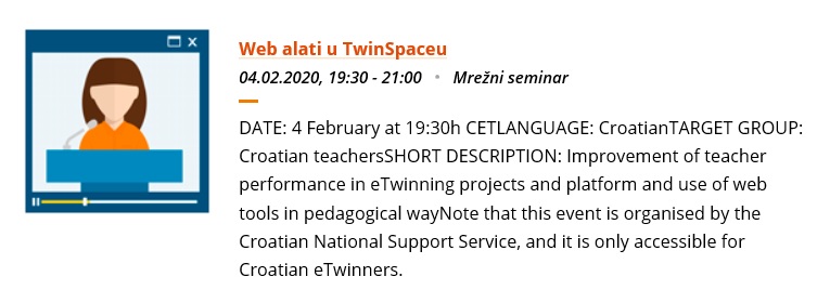 Najavljujemo radionicu profesionalnog usavršavanja pod nazivom Web alati u TwinSpaceu koju će voditi eTwinning ambasadorice Ana Marketin Sedlar i Daniela Usmiani 4.2.2020. godine. Prijavite se! Više info: https://bit.ly/2RLYbc9 pic.twitter.com/Pxkn5sKnpX