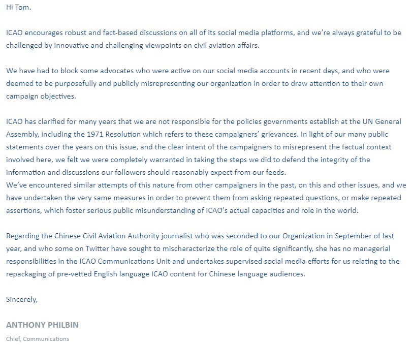 #Taiwan: https://www.hongkongfp.com/2020/01/28/wuhan-coronavirus-un-aviation-body-blocks-users-raise-issue-taiwans-inclusion-twitter … The ICAO's response to@hongkongfp in full below