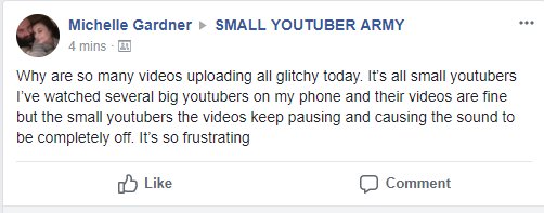 Can we get help with this I am in several small youtuber communities and all day long we have ALL had upload issues and streaming Issues yet when we go to bigger channels this is not happening is there some sort of issue?pic.twitter.com/vRzqkVqinV