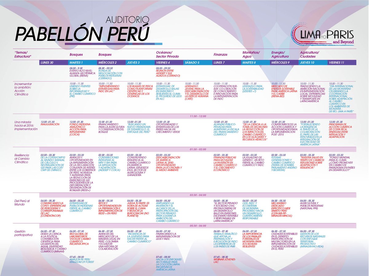 Este es el Calendario de actividades del Pabellón Perú #COP21 #Paris2015