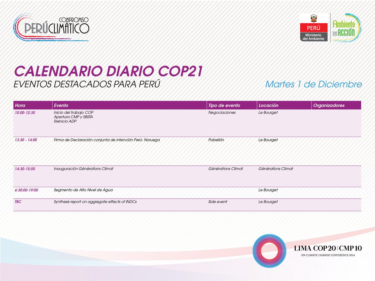 Calendario de eventos destacados para Perú en #COP21pic.twitter.com/uxWMl262zH