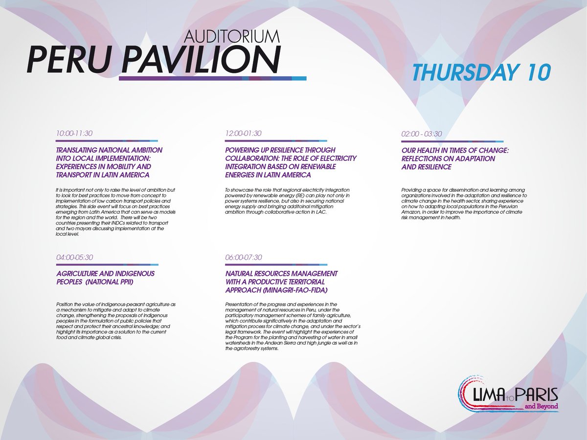 Principal activities TODAY at Peru Pavilion #COP21 #climatechange #GoCOP21 ¡Check it out!pic.twitter.com/v7MLHf59G2