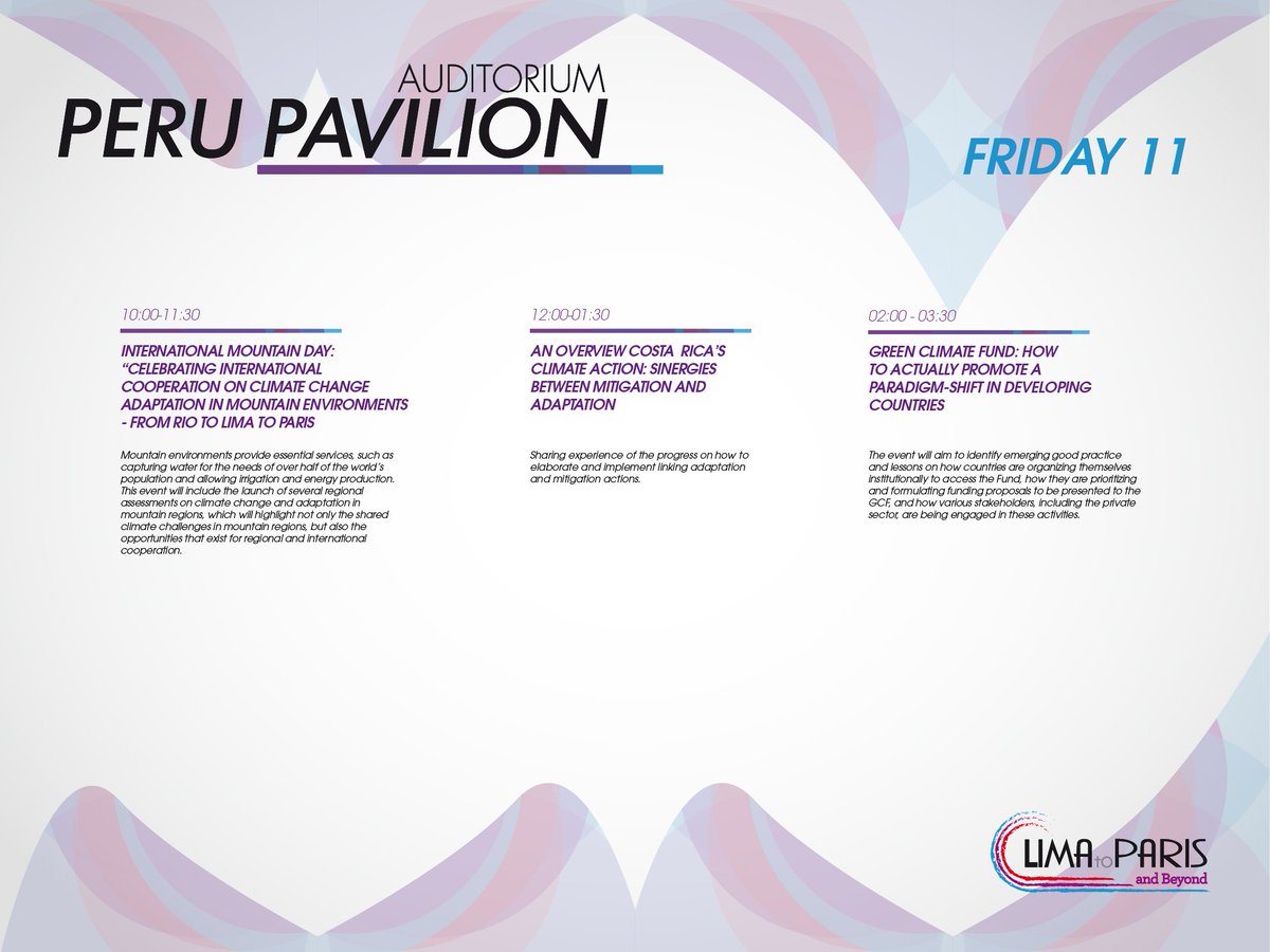 Eventos destacados en #PabellonPeru en la #COP21 ¡Particpa! #climatechange #GoCOP21pic.twitter.com/7MVOmm3wNm