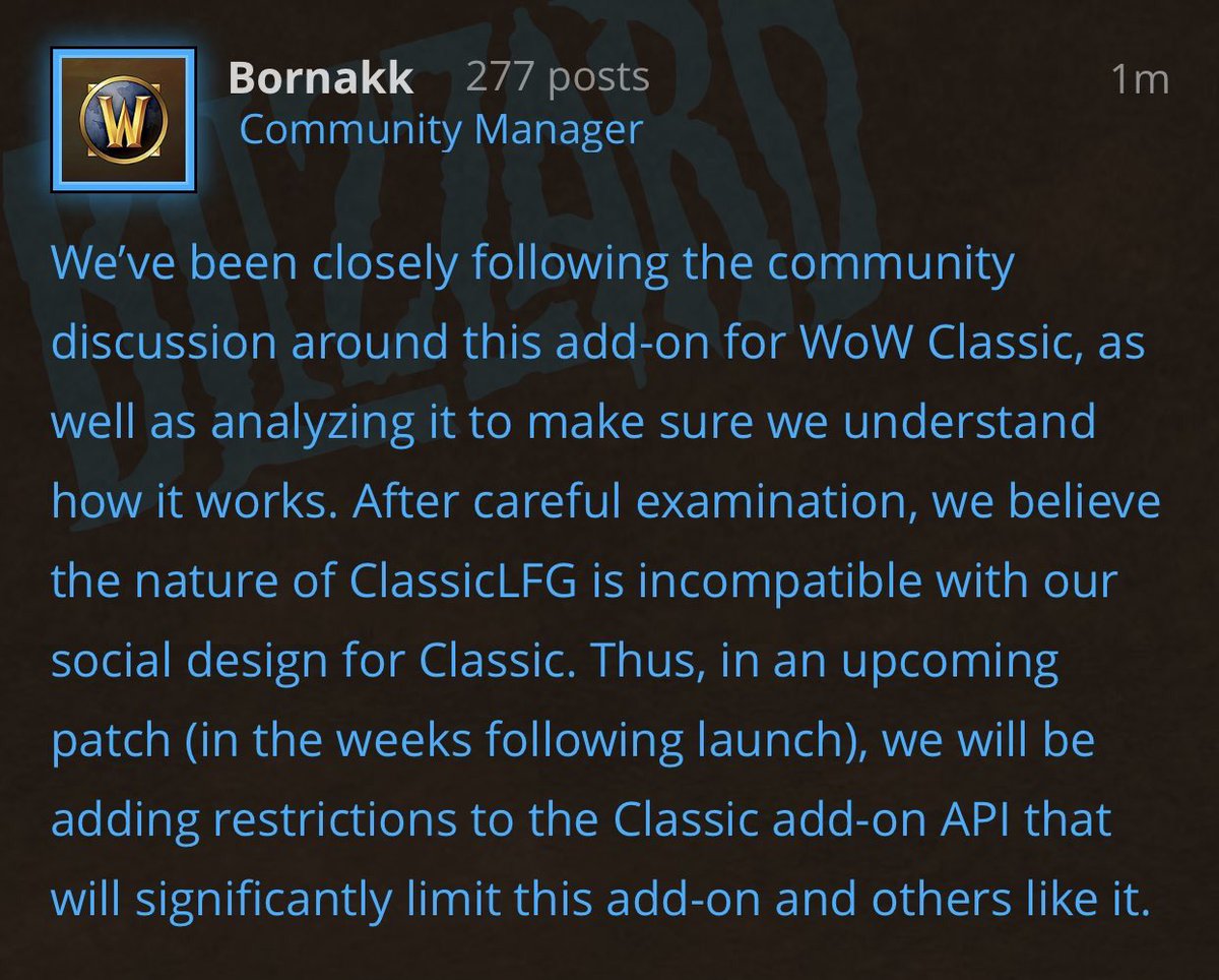 You don't get it. The mention of LFG raises a lot of eyebrows in the Classic community for a reason. Many of them including myself want Classic for many reasons one being because we think LFG is a cancer to the game. It also wasn't a thing in Classic or TBC (when Blizz tried)
