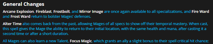 More tools is always good. Mirror image felt very missed on skittish weeks. Altered Time is coming back as a defensive utility. With Fire Ward, Blazing Barrier, Ice Block, Altered Time, Shimmer, and Cauterize the gap for Fire being the safest spec increases even more.