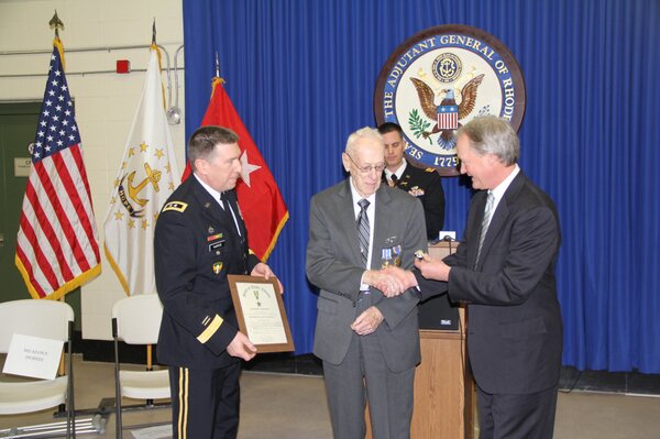 Gov. Chafee awards the Rhode Island Star to WWII veteran Capt Edouard Jacques -- on his 92nd birthday @RINationalGuardpic.twitter.com/iVE5zcO5