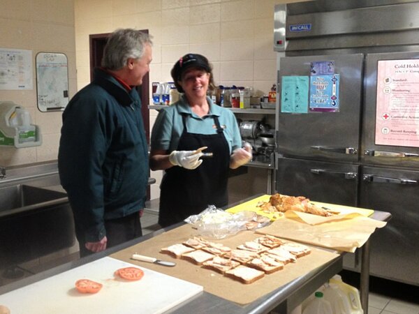 Governor Chafee thanks a generous volunteer at SK High School, preparing food for those seeking shelter #StormRIpic.twitter.com/648M9M16