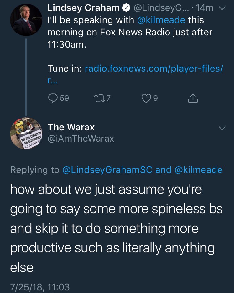 Thanks for the warning. Great job Lindsey speaking out of both sides of your mouth. At this point it’s like rearranging the deck chairs on the Titanic while this absolute clown of a president takes our democracy to the toilet.