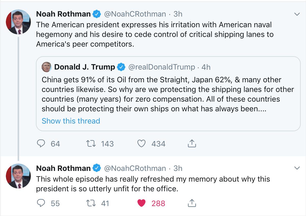 We bailed out of Nuclear Deal so if we needed International support we shunned it! Time to get out of Strait of Hormuz.... We are energy independent let the rest of the World take care of its business