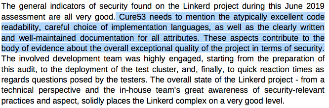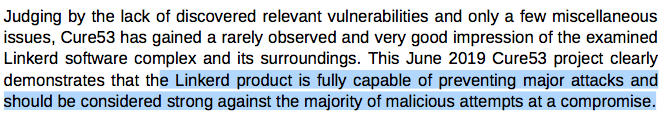 @CloudNativeFdn-sponsored 3rd party security audit is complete, and Linkerd passed with flying colors! https://github.com/linkerd/linkerd2/blob/master/SECURITY_AUDIT.pdf …pic.twitter.com/b0HIPeh6Ae