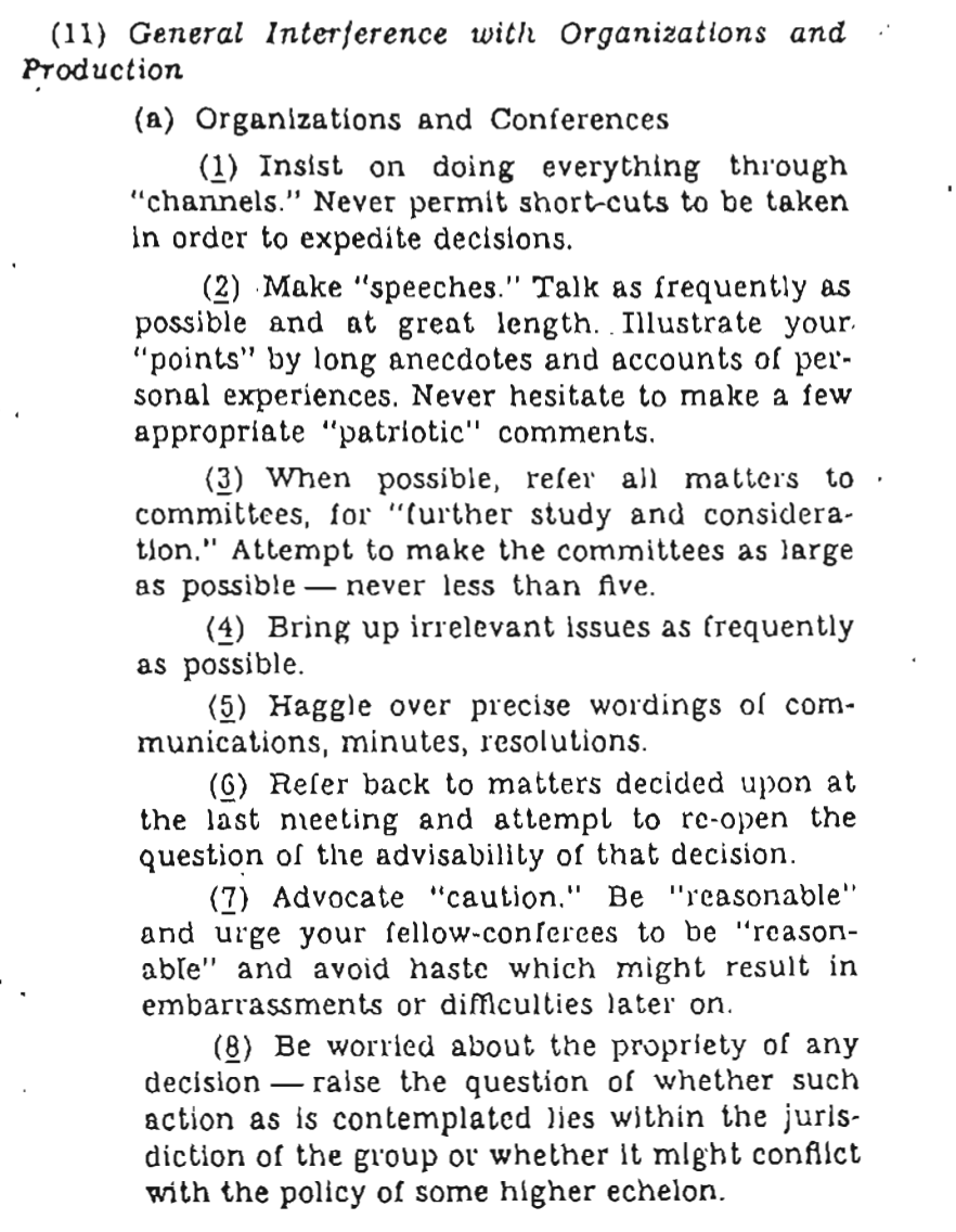 Always worth a periodic re-read of the CIA's 'Simple Sabotage' handbook and a