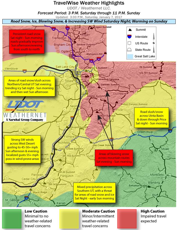 Weather Alert: Areas of rd snow/ice for UT Sat PM - Sun AM. Strong SW wind Sun PM for West Desert.