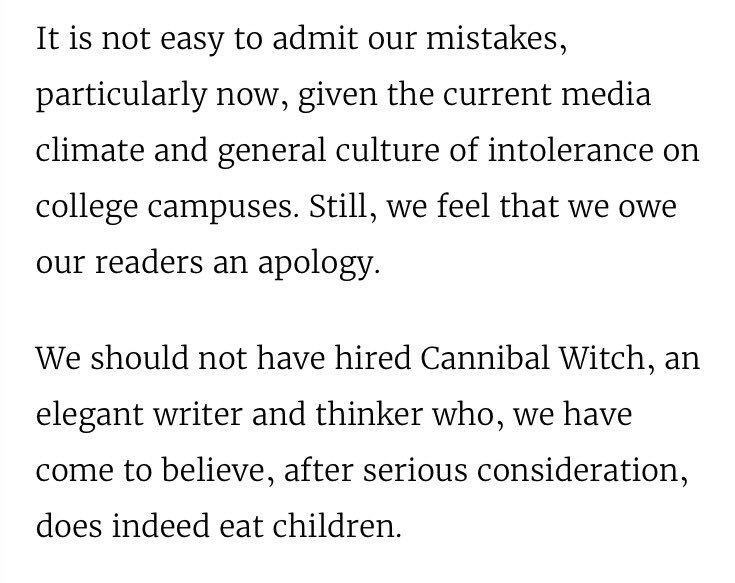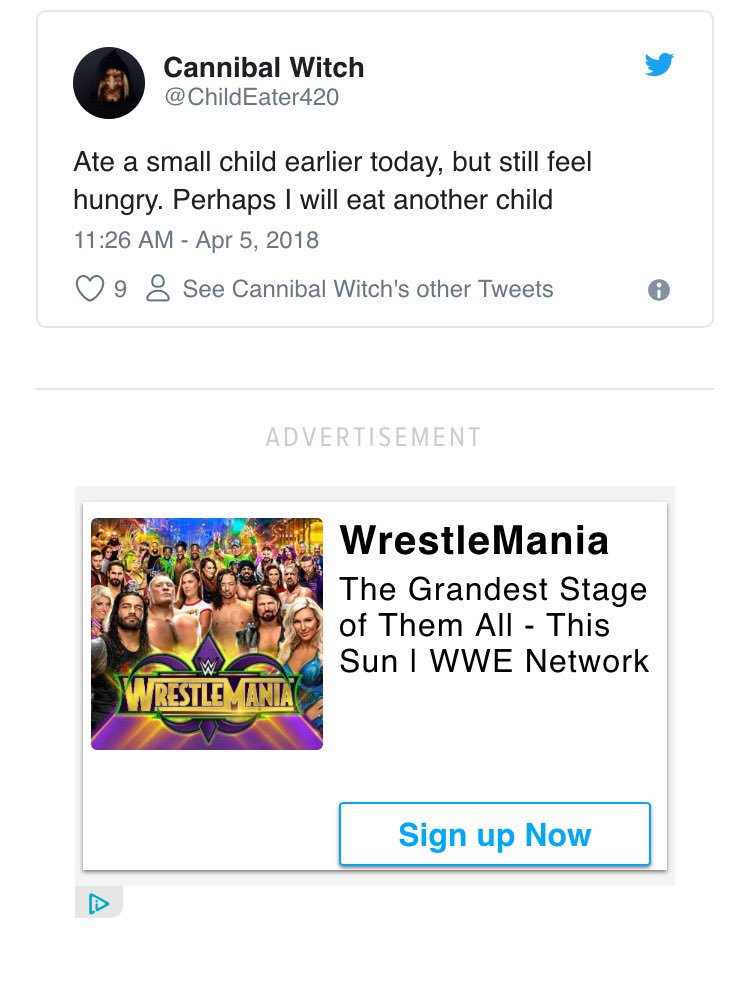 It’s not even “ funny” to say you ate a child. Since when does anyone make these statements especially on Twitter? And whoever heard of a “ Cannibal Witch”?. We shouldn’t even have to see these ppl but not even read their sick words