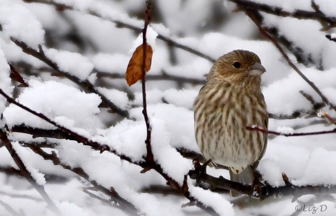 The snow was no problem for this female House Finch. Though the males are more flashy, I love her jaunty stripes!