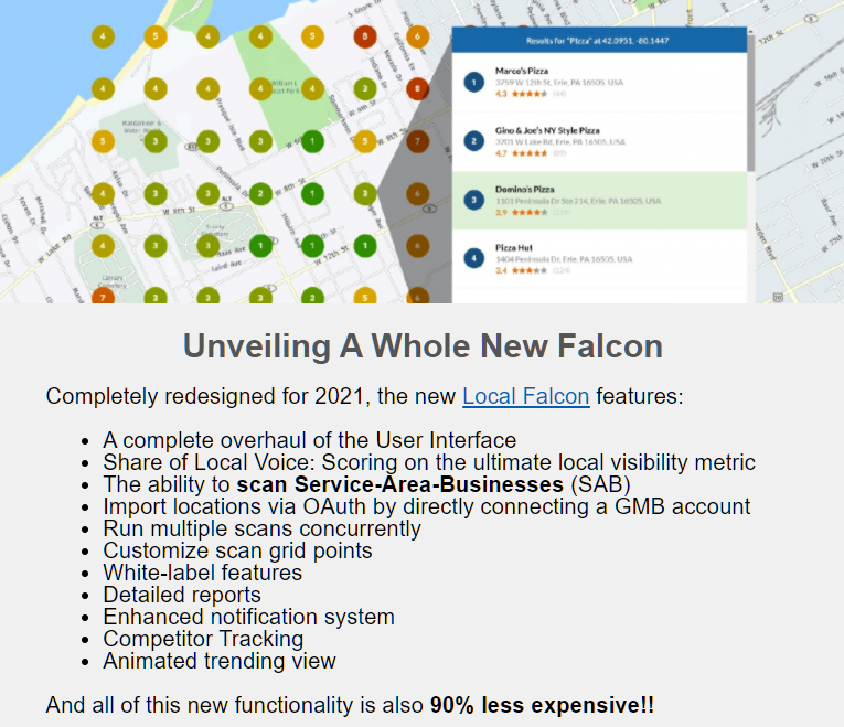 Local Falcon 3.0 is here! Completely redesigned, re-engineered, and re-imagined. Not only was the infrastructure reworked, now you're going to experience a drop-dead intuitive interface for time savings. https://www.localfalcon.com/ pic.twitter.com/jpBrpfGlWA
