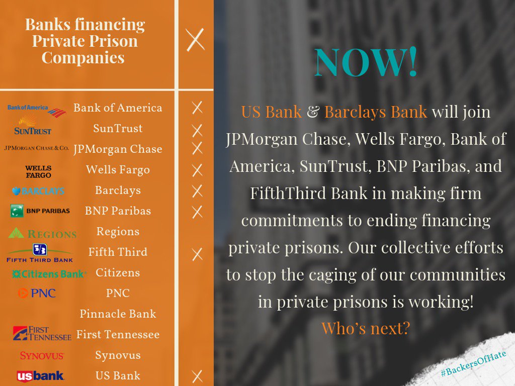ICYMI: US Bank and Barclays will no longer finance private prisons Who's next?pic.twitter.com/rO8ypboC58