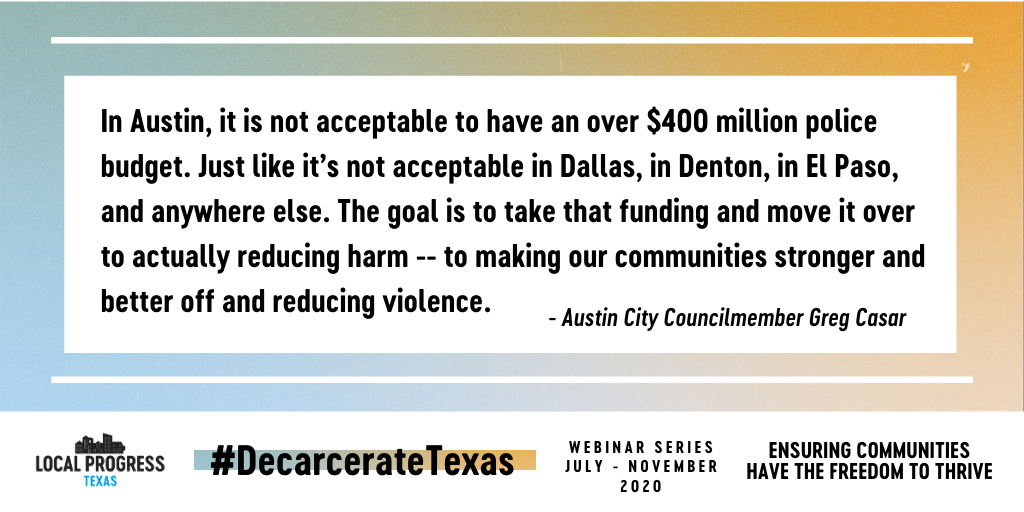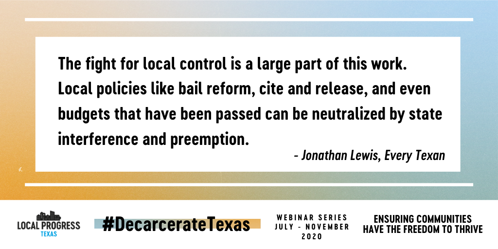 HAPPENING NOW: Local elected officials and community organizers together discussing how to #DecarcerateTexas through: ✔️ Community investment ✔️ Bail reform ✔️ Cite & release ✔️ Community oversight Join here: http://bit.ly/2WZ7ibR  and follow along here as we live-tweet!pic.twitter.com/DclNAgafhr
