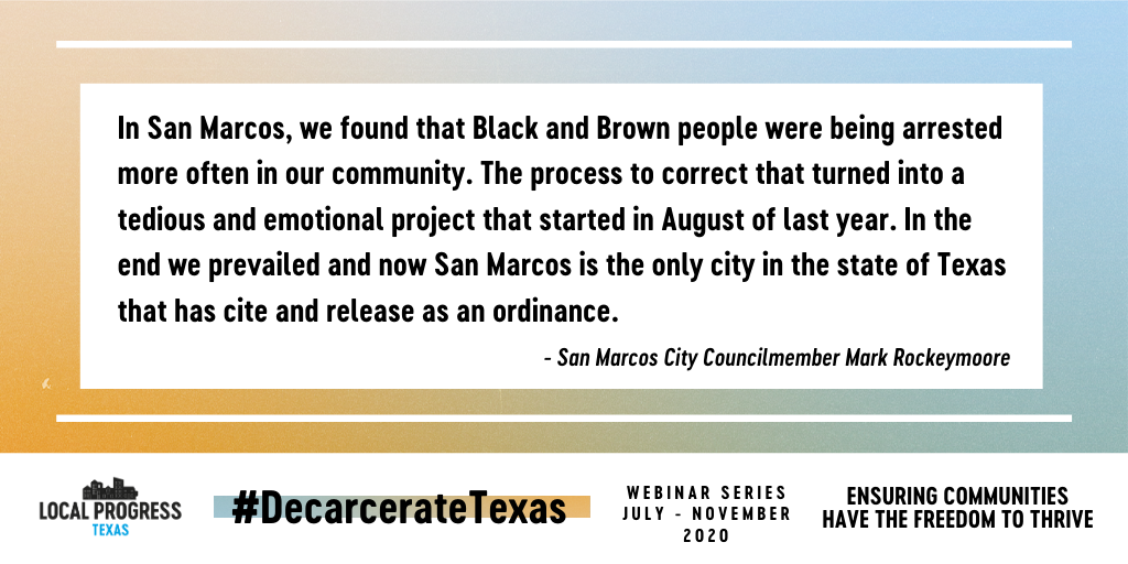 San Marcos is the only city in the state of #Texas that has "cite and release" as an ordinance. Councilmember @rockeymooreout shares about the process of getting to this critical point.pic.twitter.com/OgfBV6TR8A