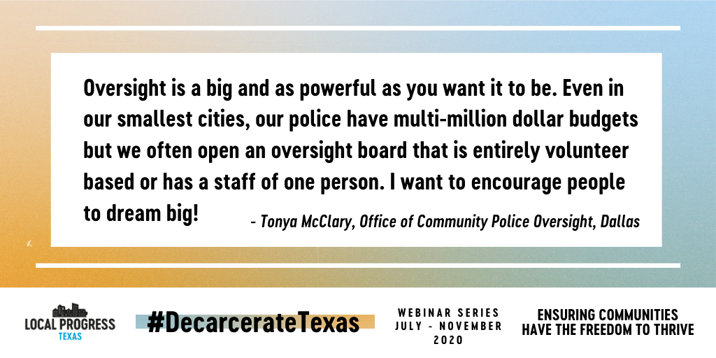 Police oversight needs independence, authority, and resources to work. "It's amazing to me when we have police departments with $500 million budgets and then the oversight office has a $250,000 budget. How are they going to have any staff and do any work?" - Tonya McClarypic.twitter.com/ECELOHoHob