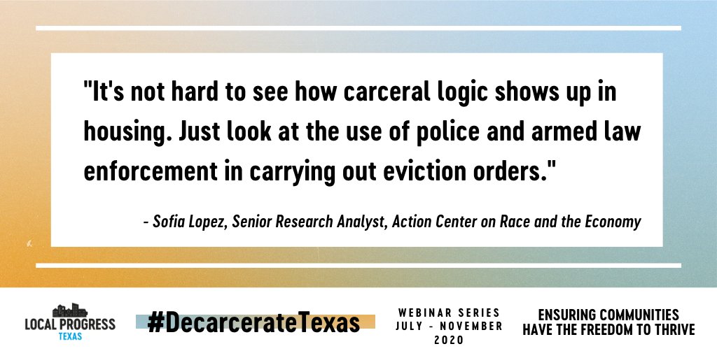 HAPPENING NOW: The fourth webinar of our #DecarcerateTexas series! We'll be discussing: ✔️ Equitable code enforcement ✔️ Regulating corporate landlords ✔️ Community land trusts ✔️ Supportive housing Follow along here as we live-tweet!pic.twitter.com/0Sh4zhF2ZC