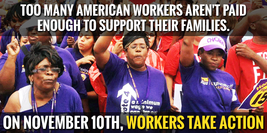 RT @SEIU Underpaid workers in fast food, home care, child care, airports & colleges unite in #FightFor15 & a union!pic.twitter.com/jIolKWzI3o