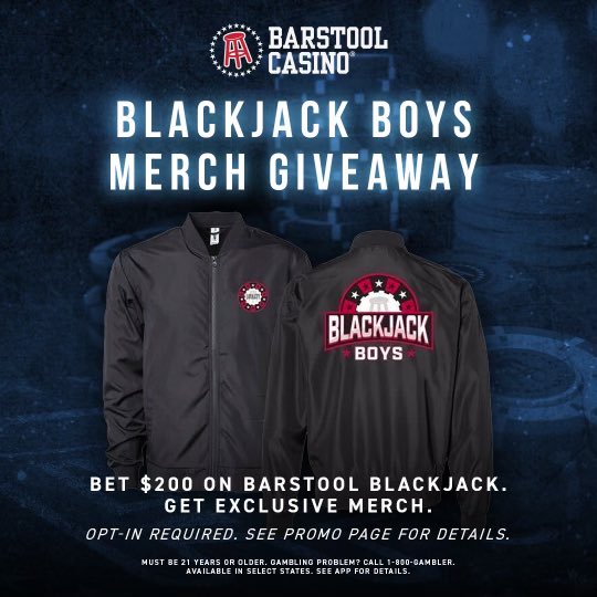 I’m on Barstool Casino @ 8:30p EST tonight Bet $200 on Barstool Blackjack and get a free Blackjack Boys jacket while you’re watching