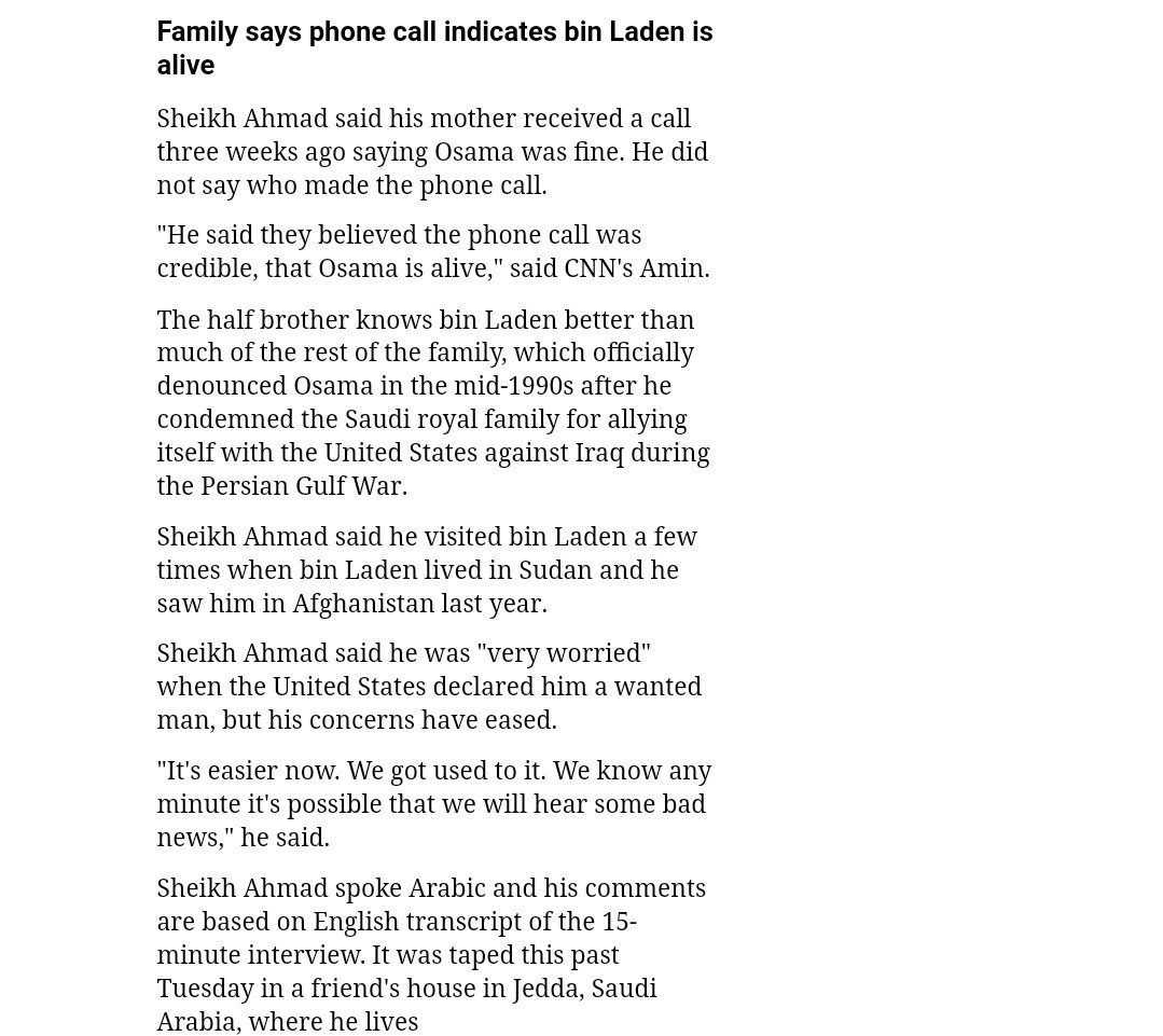 Finally, are you going to mention how two of the subjects in your interview had contact with Osama in 2001 and contact with associates of his after 09/11 [http://www.cnn.com/2002/WORLD/meast/03/18/osama.brother/index.html …]pic.twitter.com/Rw7hRhMAWy