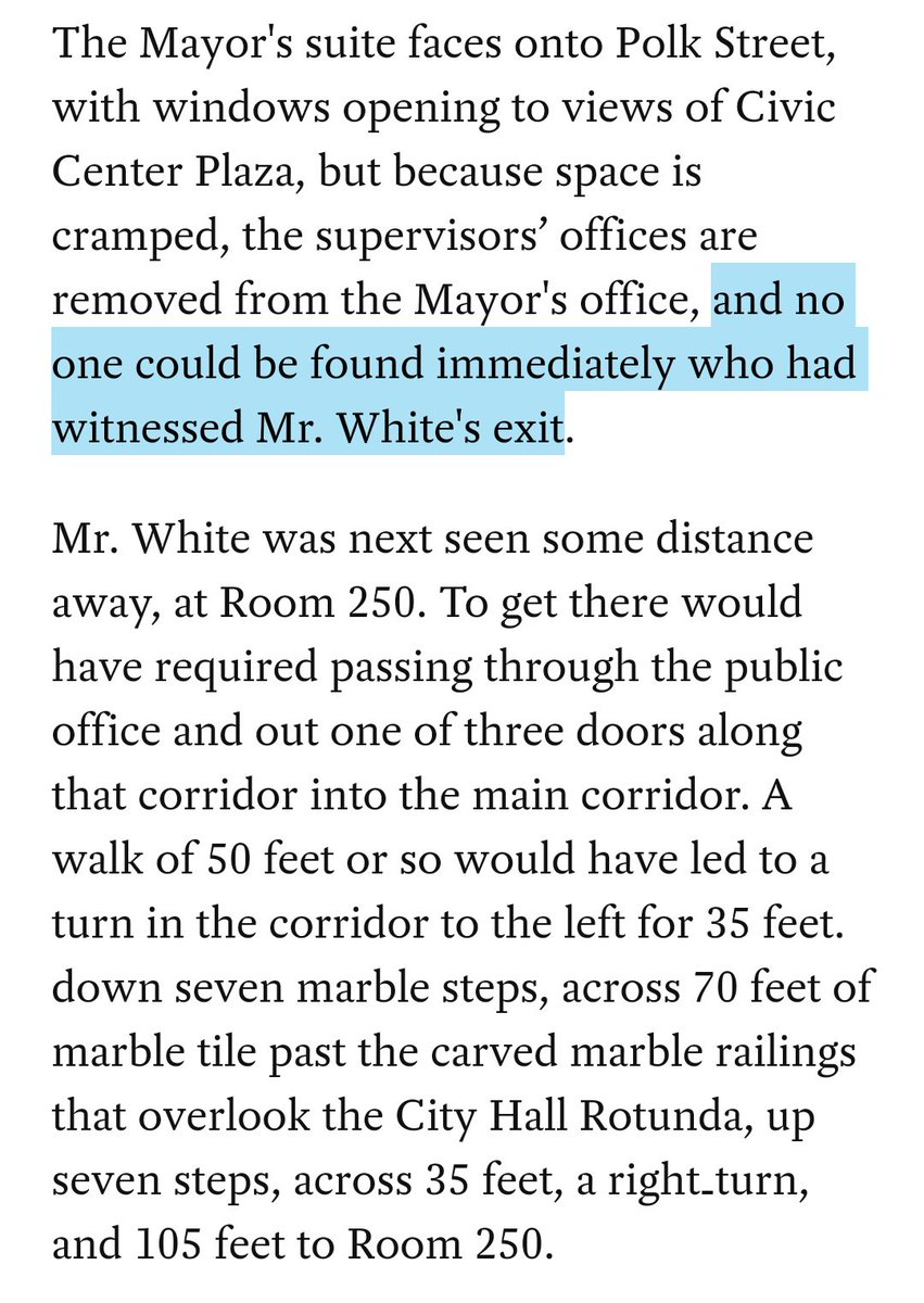 Let me get this straight: the perp gets a private audience with the mayor, shoots him, crosses in front of two armed guards, goes to the other side of the building where he "just so happened" to have a meeting with Feinstein, and then shoots Harvey Milk (again with no witnesses)pic.twitter.com/b5oHYcq6o9