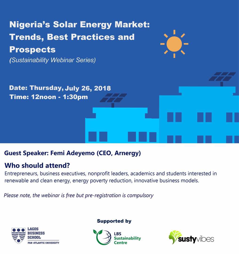 @LBSNigeria -@LBS_SustCentre and@SustyVibes have partnered to launch a sustainability webinar series!!! First episode: Nigeria’s Solar Energy Market: Trends, Best Practices and Prospects with@femiadeyemo Register: http://sustyvibes.com/renewable-energy-webinar/ …pic.twitter.com/zw8d6k546y