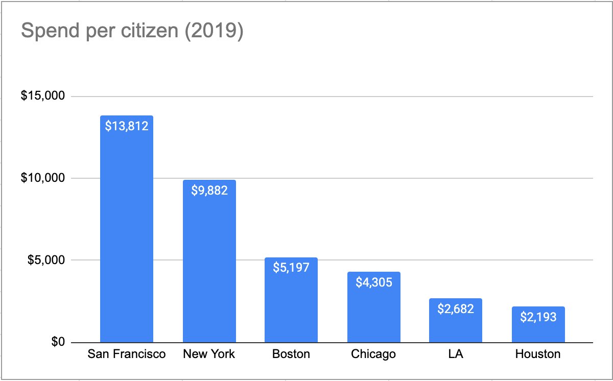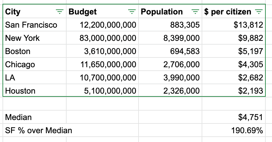 It appears our budget per citizen is ~2x that of other cities... Why are we cutting everything across the board 10%? Should we not consider eliminating big chunks of the budget that are not efficient or effective?pic.twitter.com/QNCfAuhfxm