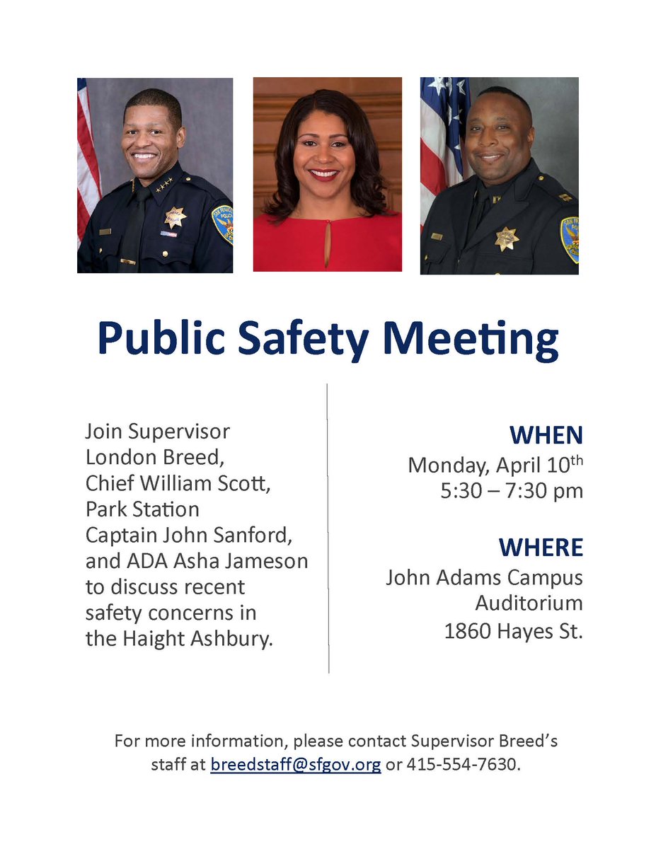 Please join me, @SFPDChief, & @SFPDPark @ 5:30 tonight @ John Adams auditorium for a public safety meeting re the Haight. Everyone welcome.pic.twitter.com/sIOOg60krV
