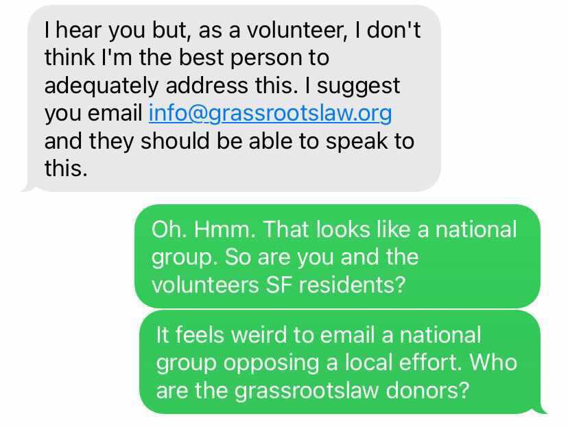 Yeah I keep getting them too. 3 volunteers so far. One out of state, one out of city/country, one Western Addition. Seemingly no cognitive dissonance texting that script while volunteering for a Shaun King project (funded by 2 of the 4 in here https://www.politico.com/states/california/story/2021/07/17/four-wealthy-donors-fuel-overhaul-of-californias-criminal-justice-system-1388261 …)pic.twitter.com/xmuyDhbM3b