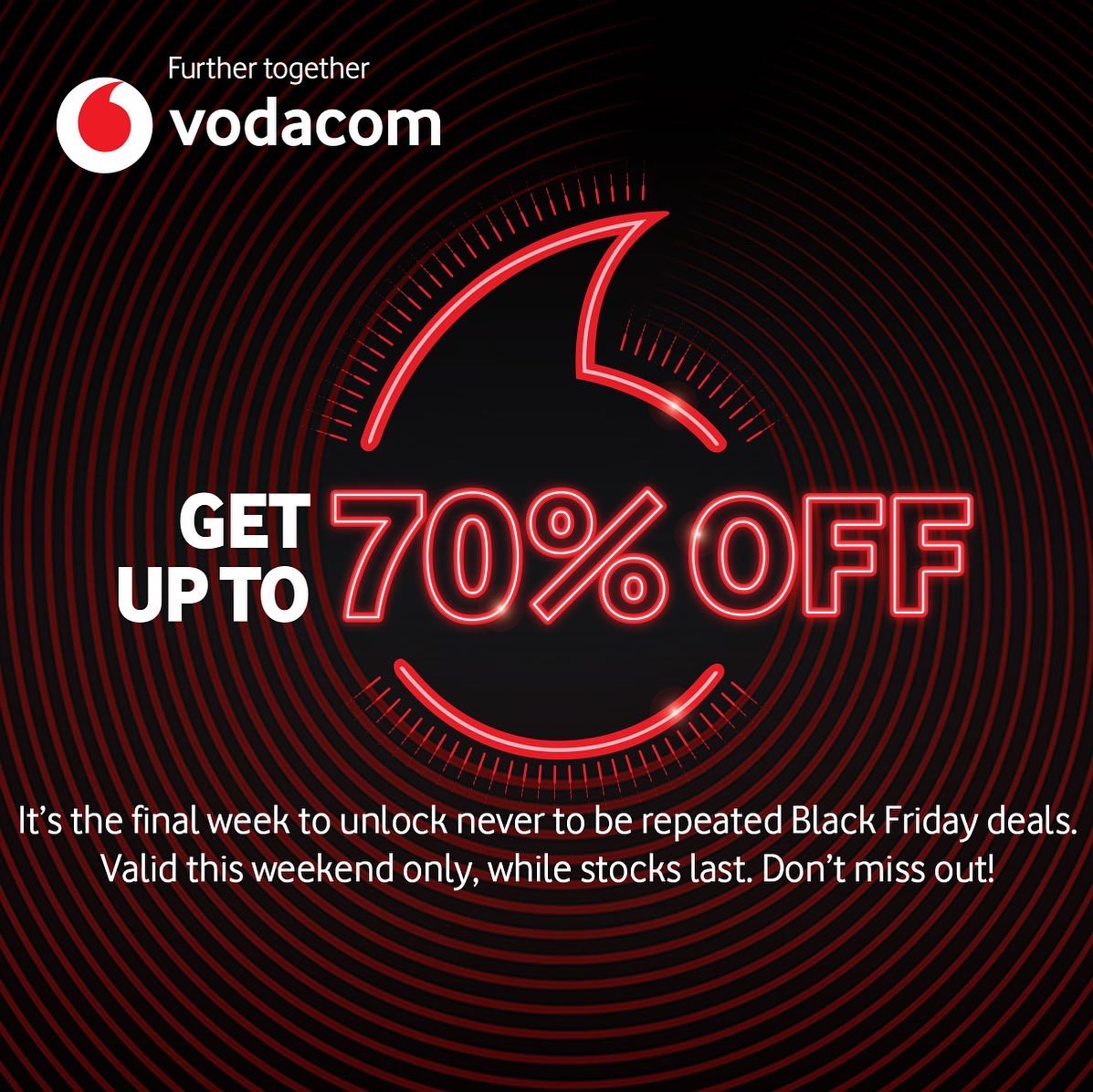 @Vodacom Black Friday Deals. Valid this weekend only, while stocks last. Don’t miss out! Stand to win Bathu shoes and R2000 Pick n Pay vouchers by retweeting and tag 5 friends using#VodacomBlackFriday. Check out for more dealspic.twitter.com/WA3IOi5aSo