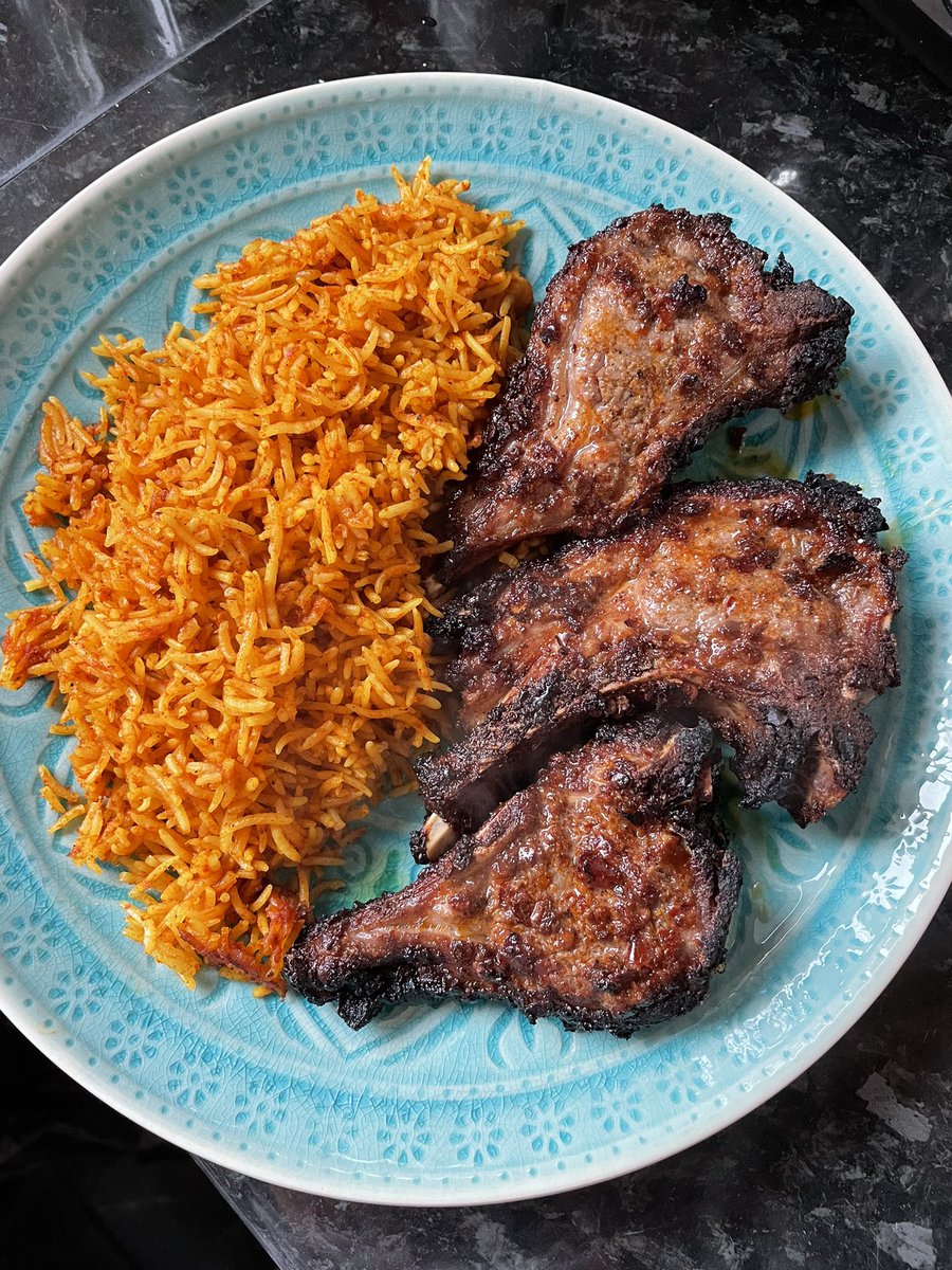 Jollof!!! Spicy, flavoursome rice-love of my life! So satisfying to make, served w/ my harissa marinated lamb chops cooked to perfection in just 15 mins. For best Jollof recipes, follow some real African cooks