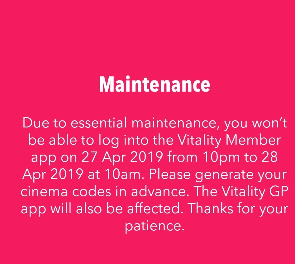 Vitality app has been under maintenance all weekend and is still broken.. What year is this??