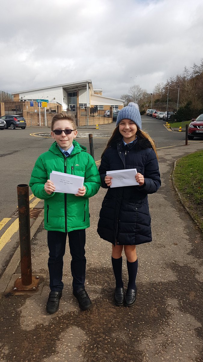 Abigail and Jake on their way to deliver P7a's S1 pen pal letters to
