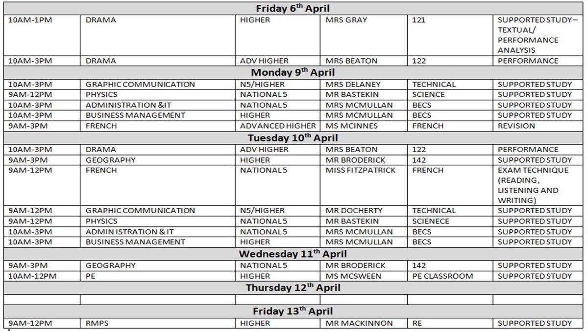 Lourdes Secondary School Easter Revision classes are available during the school holidays Fri 30 March – Fri 13 April. Pupils are strongly encouraged to attend these classes. Please see school website for the timetable: https://blogs.glowscotland.org.uk/gc/LourdesSecondarySchool/ …