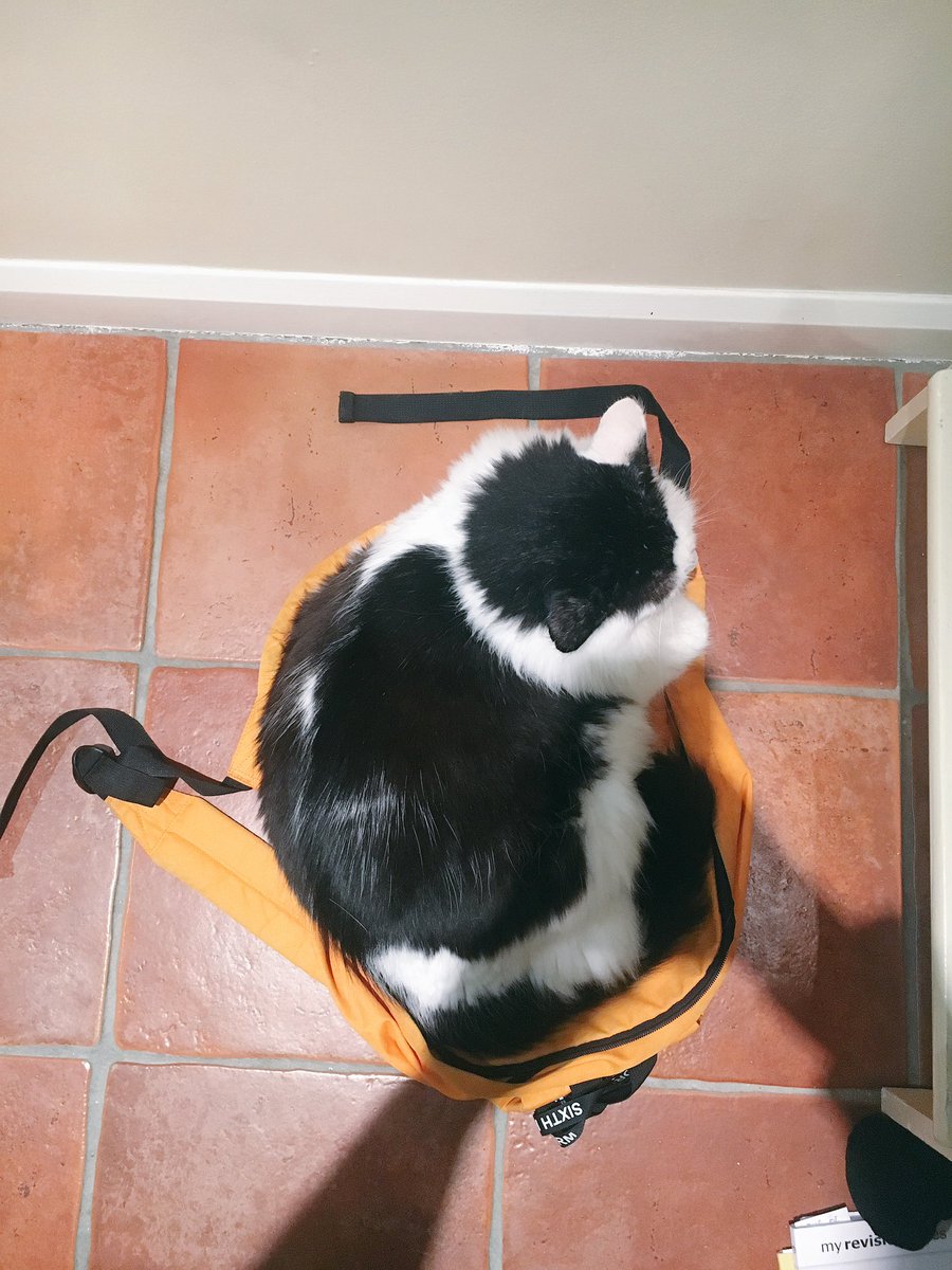 I’m helping the older teenage human with her school work by sitting on her school bag! I think I deserve an A+ grade for effort