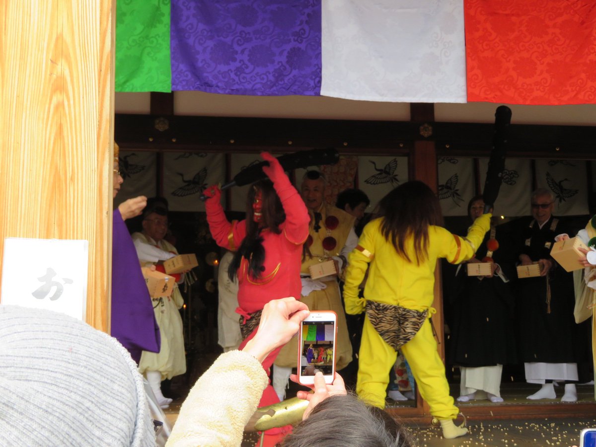 今日は節分。ちょうどお休みだったので、京都へ。まずは、聖護院の節分祭・追儺式に行ってきました。鬼が登場して暴れまわる。その鬼に豆を投げつけ、やっつけてひれ伏しさせる。そして、改心した鬼も含めて豆撒き。という流れの行事でした。最後は、鬼のご加護も。福豆も2つゲットできました。pic.twitter.com/SpgH9Jg21J