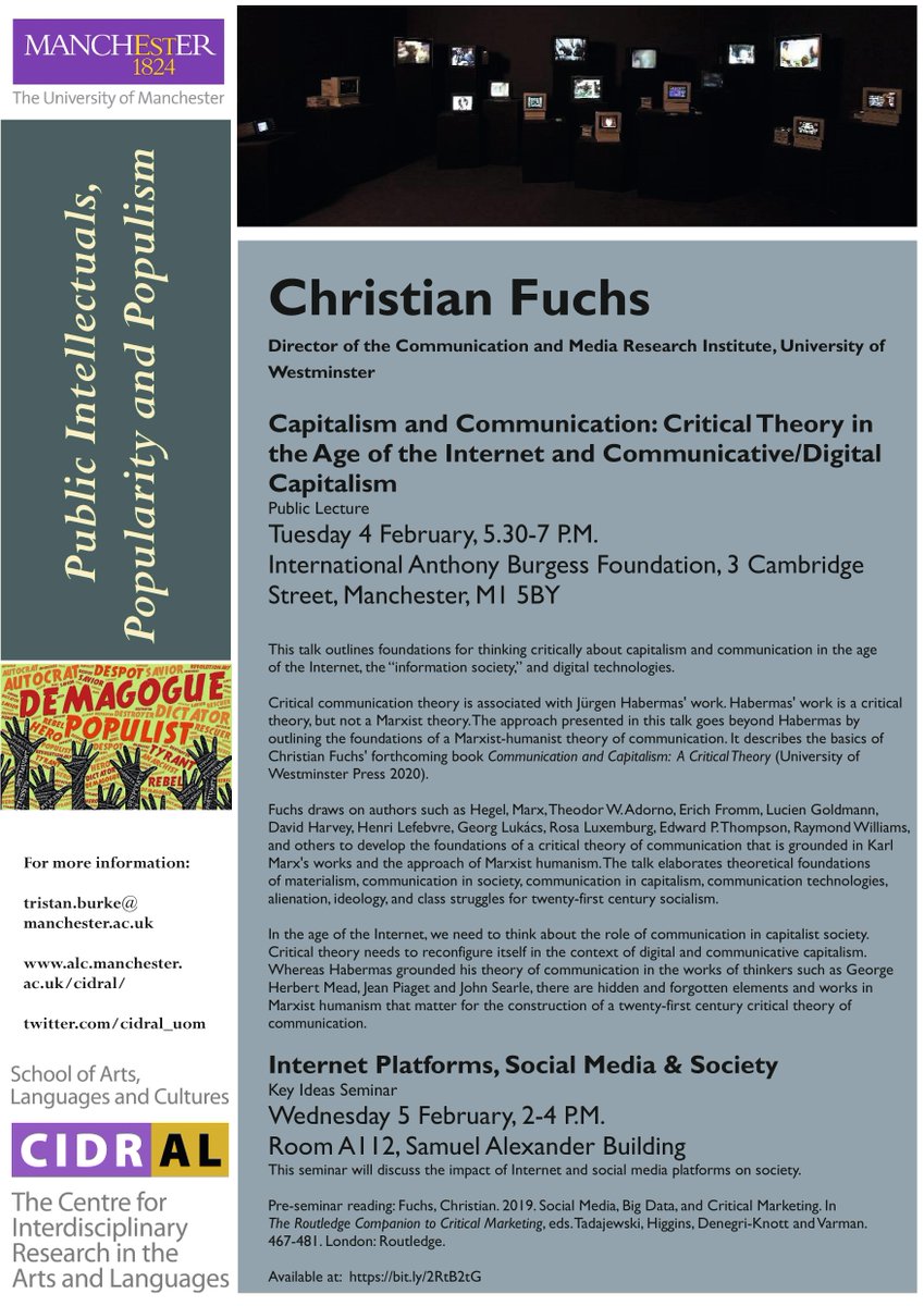 4 Feb, 5.30pm, International Anthony Burgess Foundation: Christian Fuchs (Westminster), Capitalism and Communication: Critical Theory in the Age of the Internet and Communicative/Digital Capitalism. Full details: https://events.manchester.ac.uk/event/event:m9p-k5mbp89r-xyd95b …pic.twitter.com/WFLZXWzWcG