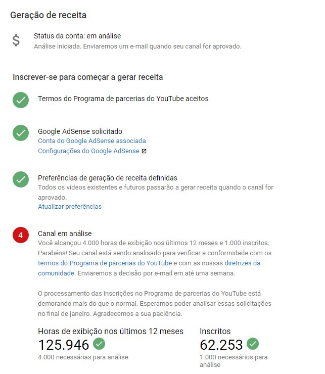 Olá. As aplicações para o Programa de Parceiros do YouTube ainda estão em atraso. Esperamos poder rever todas as solicitações abertas até o final de abril. Obrigado pela sua paciência!