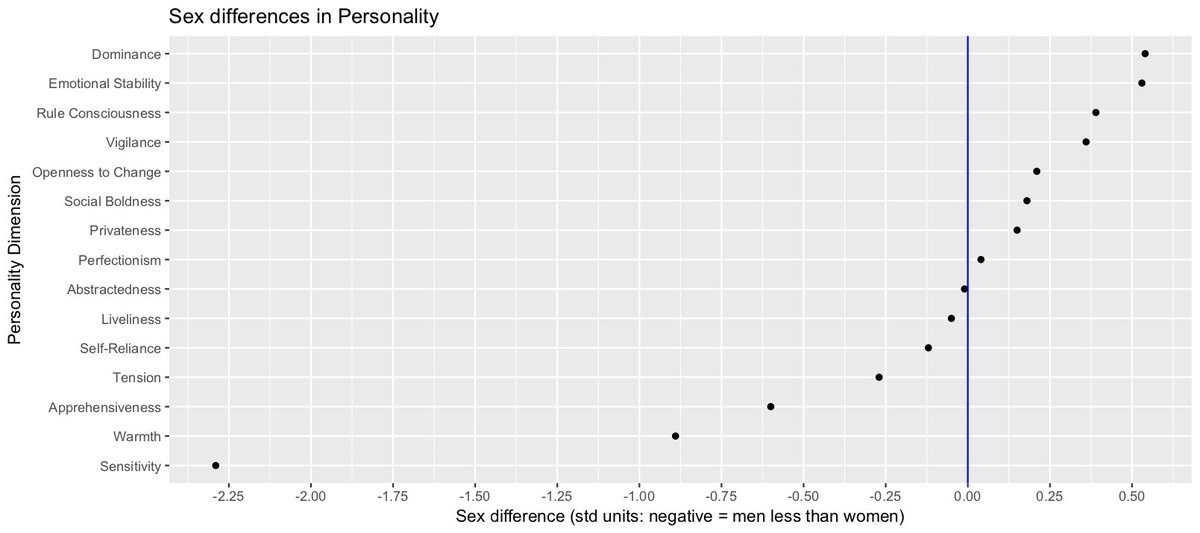 Sex Differences in Personality >0: higher average score for men <0: higher average score for women Source: https://en.wikipedia.org/wiki/Sex_differences_in_psychology#/media/File:Sex_differences_in_personality.R.png …pic.twitter.com/VXr0gaLULJ