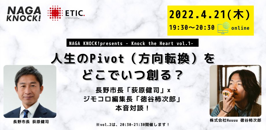 \オンライントークイベント/ 第1部 長野市長「荻原健司」×ジモコロ編集長「徳谷柿次郎」が本音対談! 第2部 ゼブラアンドカンパニー「田淵良敬」×one&only「北澤崇史」が語る人生の方向転換 ・都市部ではなく、あえて地域で働く理由 ・人生の方向を転換させた出来事とは https://knocktheheart.peatix.com/ pic.twitter.com/cpOF0vhFOA