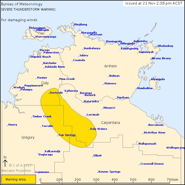 #SevereThunderstormWarning issued for the southwest#TopEnd, strong#thunderstorms detected west of#Katherine and near#DalyWaters. Damaging winds possible. http://ow.ly/uGmz30gIfBu pic.twitter.com/rkkDCyhfVE