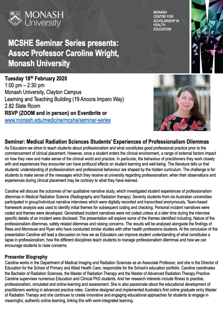 Join us for the first MCSHE seminar of 2020 where Assoc Prof Caroline Wright will present "Medical radiation sciences students' experiences of professionalism dilemmas". Both face-to-face and videoconference are available. Register here: http://www.monash.edu/medicine/mcshe/seminar-series …pic.twitter.com/U8Hr98ktlm