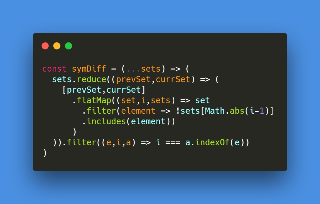 #100DaysOfCode Day006: BEHOLD, a pure function that returns the symmetric difference of two or more arrays using flatMap! I love flatMap!!#javascriptpic.twitter.com/zb681Q6A3V